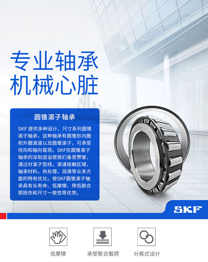 SKF圓錐滾子軸承,可以分離,由內圈與滾子、保持架一起組成的組件和外圈可以分別安裝。